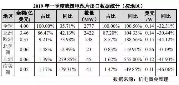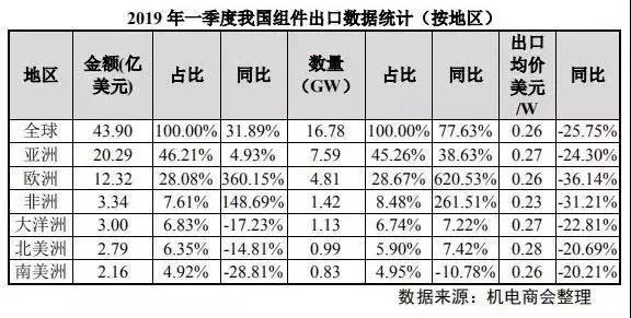 從出口區(qū)域看,2019 年一季度我國(guó)組件出口到亞洲、歐洲、非洲、大洋洲、北美洲和南美洲;其中出口亞洲金額達(dá) 20.29 億美元,占總出口金額的 45%以上,同比增長(zhǎng) 4.93%,出口亞洲數(shù)量 7.59GW,總比大幅增長(zhǎng) 38.63%。