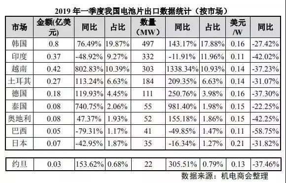 2019 年一季度我國(guó)電池片出口至 64 個(gè)國(guó)家,電池片出口額為 4 億美元,同比增長(zhǎng) 35.71%;出口數(shù)量為 2.78GW,同比增長(zhǎng) 100.5%;出口均價(jià)為 0.14 美元/W,同比大幅下降 32.31%。