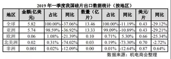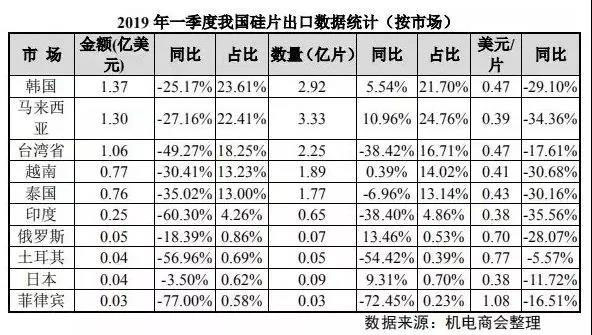 2019 年一季度我國(guó)硅片出口至 22 個(gè)國(guó)家和地區(qū),硅片出口額為 5.82 億美元,同比大幅下降 37.06%;硅片出口量約 13.46 億片,同比下降 11.19%;出口均價(jià)0.43 美元/片,同比大幅下降 29.12%。
