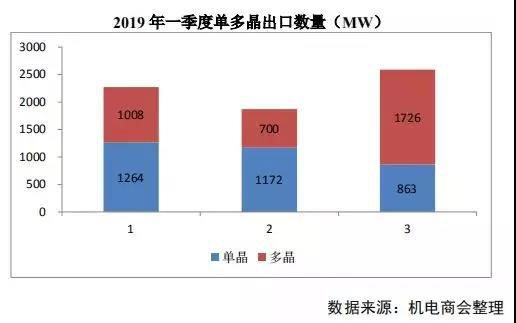 2019 年一季度單晶硅片出口數(shù)量 3.30GW,多晶硅片出口數(shù)量 3.43GW,單晶和多晶硅片的出口數(shù)量比例接近 1:1。
