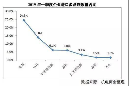 從進(jìn)口企業(yè)看,2019 年一季度多晶硅進(jìn)口數(shù)量前七位企業(yè)分別是隆基、晶科、中環(huán)、榮德新能源、晶科、仁德新能源、晶澳和天合,前七位企業(yè)進(jìn)口數(shù)量占總進(jìn)口數(shù)量的一半以上,其中隆基 24.6%占比排在首位。