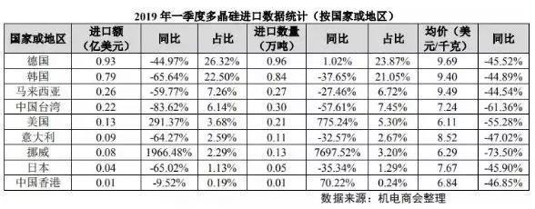 2018 年 11 月 1日起,對(duì)原產(chǎn)于歐盟的進(jìn)口太陽(yáng)能級(jí)多晶硅所適用的反傾銷(xiāo)措施和反補(bǔ)貼措施終止實(shí)施,受此影響,德國(guó)取代韓國(guó)成為中國(guó)第一大多晶硅進(jìn)口來(lái)源國(guó)地位,2019年一季度自德國(guó)進(jìn)口金額 0.93 億美元,占總進(jìn)口額的 26.32%,同比下降 44.97%;進(jìn)口數(shù)量 0.96 萬(wàn)噸,同比增長(zhǎng) 1.02%。