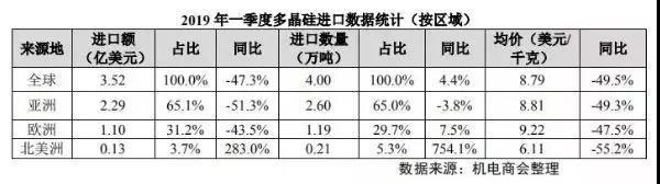 從進(jìn)口區(qū)域看,2019 年一季度自亞洲和歐洲進(jìn)口多晶硅幾乎全部來(lái)自亞洲和歐洲,全年平均進(jìn)口單價(jià)為 8.79 美元/千克。