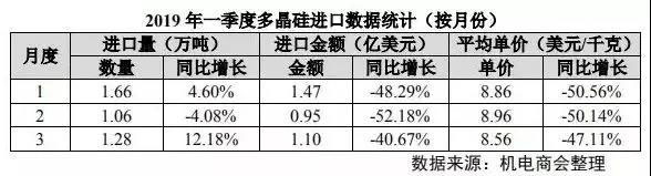 2019 年一季度,我國(guó)多晶硅進(jìn)口量達(dá) 4 萬(wàn)噸,同比提高 4.4%;進(jìn)口金額 3.52億美元,同比大幅下降 47.3%;多晶硅進(jìn)口均價(jià)為 8.79 美元/千克,同比降幅接近一半。