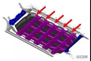 電池包前后端都應(yīng)有2個(gè)以上安裝點(diǎn),安裝點(diǎn)分布應(yīng)均勻,防止出現(xiàn)應(yīng)力集中點(diǎn)。建議電池包的中間部位布置二到四個(gè)連接點(diǎn),與車身地板橫梁連接,有利于提升電池包抵抗沖擊和顛簸載荷的能力,也能夠提升電池包整體模態(tài)頻率。