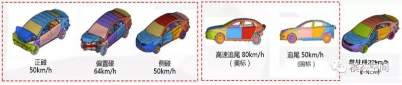 C-NCAP規(guī)定的三個(gè)整車碰撞工況(正面100%重疊剛性壁障碰撞、正面40%重疊可變形壁障碰撞、側(cè)面碰撞)下,電池包殼體結(jié)構(gòu)變形必須控制在很小的范圍,不能擠壓到電池單體。