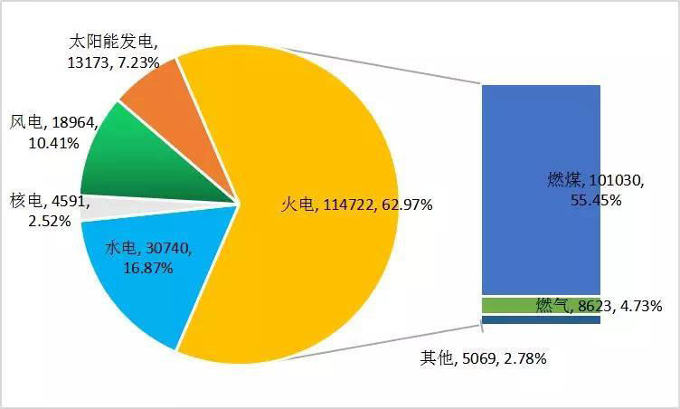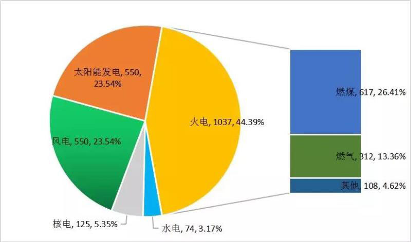 可以看出,火電仍然是電源新增生產(chǎn)能力的主要構(gòu)成部分,占比44.39%。隨后依次是太陽能發(fā)電23.54%、風(fēng)電23.54%、核電5.35%和水電3.17%。