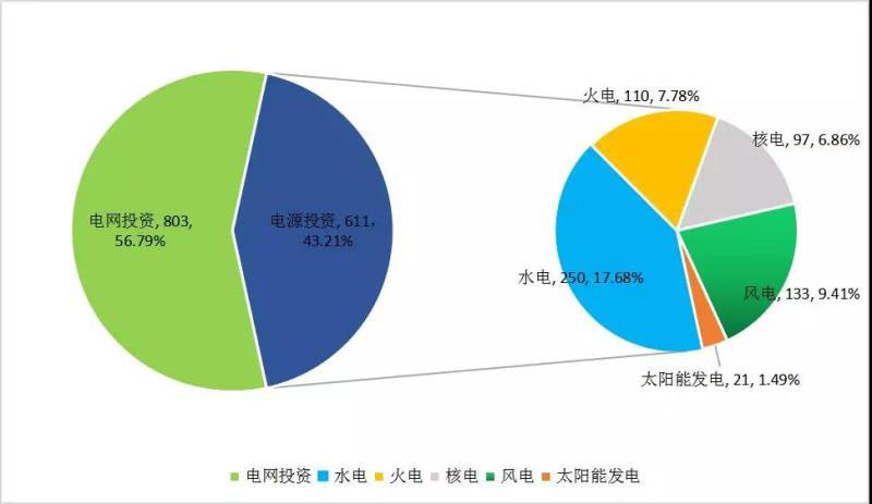 2019年1-4月,全國電網(wǎng)工程完成投資803億元,同比減少19.1%;全國主要發(fā)電企業(yè)電源工程完成投資610億元,同比增加11%。分類型看,全國完成水電投資249億元,同比增加62.3%;風(fēng)電133億元,同比增加42.1%;太陽能發(fā)電21億元,同比增加16.8%;火電110億元,同比減少32.8%;核電97億元、同比減少20.2%。下圖是2019年1-4月全國電力投資構(gòu)成情況。