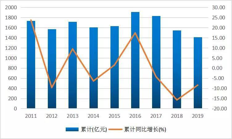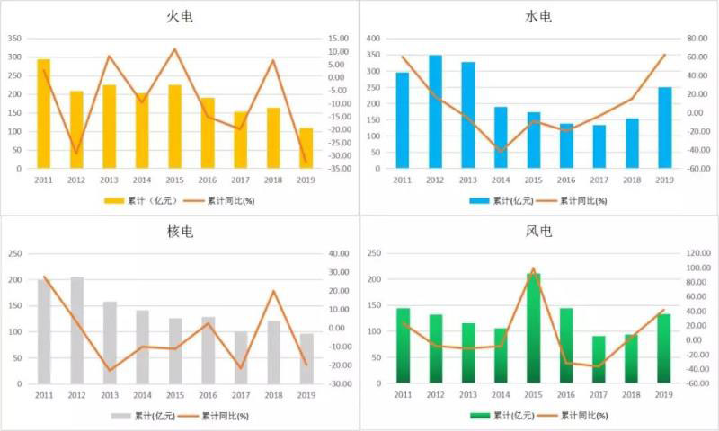 據(jù)統(tǒng)計(jì),2019年1-4月全國共完成電力投資累計(jì)1413億元,同比減少8.43%。下圖是歷年1-4月全國電力投資情況。