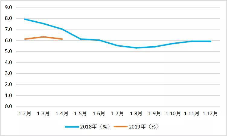 1-4月份,全國固定資產(chǎn)投資(不含農(nóng)戶)155747億元,同比增長6.1%,增速比1-3月份回落0.2個百分點(diǎn),與1-2月份持平。下圖是2018-2019年全國固定資產(chǎn)投資增速同比情況。