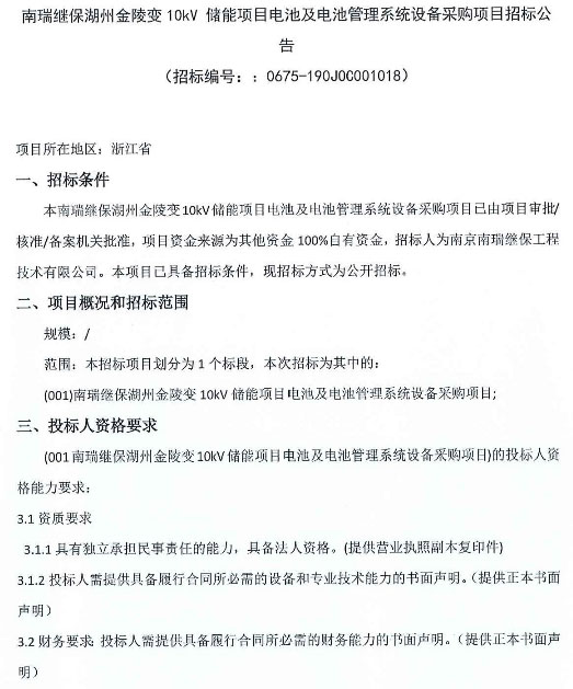中國(guó)儲(chǔ)能網(wǎng)訊:近日,浙江湖州金陵變10kV儲(chǔ)能項(xiàng)目開(kāi)啟招標(biāo),公告顯示招標(biāo)人為南瑞繼保工程技術(shù)有限公司,招標(biāo)范圍包含儲(chǔ)能電池及電池管理系統(tǒng)設(shè)備采購(gòu)。要求投標(biāo)人3年內(nèi)有電網(wǎng)側(cè)儲(chǔ)能應(yīng)用業(yè)績(jī)。