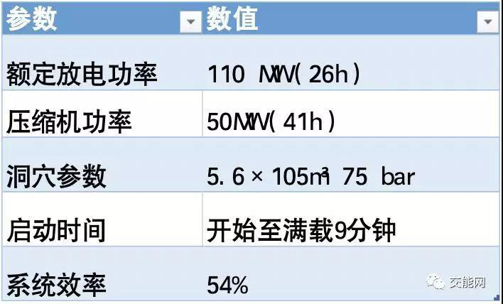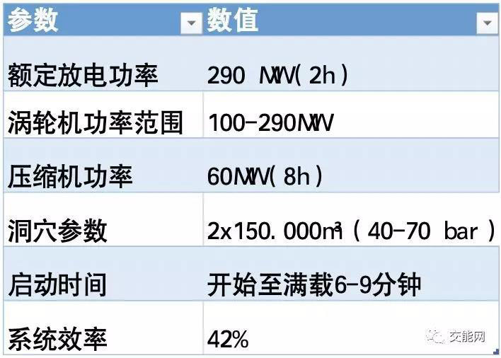 機(jī)組的壓縮機(jī)功率60MW,釋能輸出功率為290MW,最長額定輸出時間為2小時。系統(tǒng)將壓縮空氣存儲在地下600m的廢棄礦洞中,礦洞總?cè)莘e達(dá)3.1×105m3,壓縮空氣的壓力最高可達(dá)10MPa。機(jī)組可連續(xù)充氣8h,連續(xù)發(fā)電2h。該電站在1979年至1991年期間共啟動并網(wǎng)5000多次,平均啟動可靠性97.6%。電站采用天然氣補(bǔ)燃方案,實際運(yùn)行效率約為42%,扣除補(bǔ)燃后的實際效率為19%。