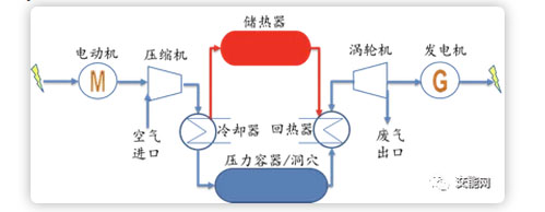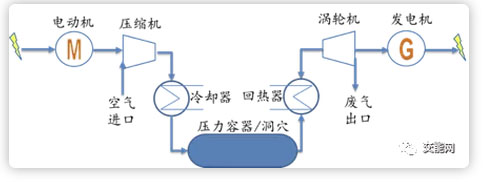 其工作原理是,在用電低谷時段,利用電能將空氣壓縮至高壓并存于洞穴或壓力容器中,使電能轉(zhuǎn)化為空氣的內(nèi)能存儲起來;在用電高峰時段,將高壓空氣從儲氣室釋放,進(jìn)入燃燒室燃燒利用燃料燃燒加熱升溫后,驅(qū)動渦輪機(jī)發(fā)電。其原理圖如下: