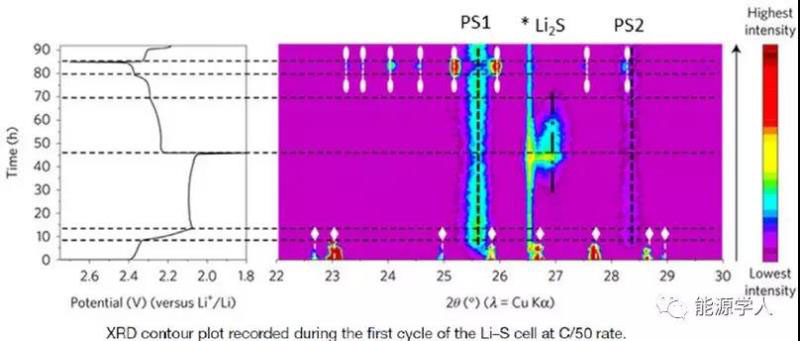 OperandoX射線衍射(XRD)是跟蹤晶體材料結(jié)構(gòu)變化的一種選擇技術(shù),在Li-S電池中,有四種可能的固相,即硫的α-和β-多晶型,放電產(chǎn)物L(fēng)i2S和Li2S2相,可以通過(guò)XRD觀察到。雖然硫正極的概念從20世紀(jì)70年代初就已經(jīng)知道了,但直到最近才發(fā)現(xiàn),首次循環(huán)之后,硫不會(huì)回到其α-多晶型,而是以β-型存在。同樣,近期人們才更多地關(guān)注鋰-硫電池放電產(chǎn)物的研究,Li2S產(chǎn)物在在低電位區(qū)域生成。至于Li2S2相,迄今為止,在標(biāo)準(zhǔn)電化學(xué)條件下還沒(méi)有用XRD進(jìn)行鑒定。幾個(gè)研究小組報(bào)告說(shuō),由于這一階段的高度不穩(wěn)定性,無(wú)法檢測(cè)到;也有報(bào)告稱(chēng)Li2S2可能是高度無(wú)序的相,無(wú)法通過(guò)XRD進(jìn)行鑒定;其他研究人員認(rèn)為,Li2S2的壽命太短,任何技術(shù)都無(wú)法檢測(cè)到。直到最近,Paolella等人利用“鹽中溶劑”方法提出了Li2S2相的XRD特征,盡管其結(jié)果與大多數(shù)理論預(yù)測(cè)的空間群和晶體結(jié)構(gòu)相矛盾。