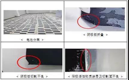 (解體、分析)多數(shù)的事故可以確定為是由于使用了同一工廠(chǎng)相似時(shí)期內(nèi)生產(chǎn)的電池。因此,為確認(rèn)電池生產(chǎn)過(guò)程中的缺陷,對(duì)電池進(jìn)行了解體分析。結(jié)果表明,一家公司的一部分電池中存在極片折疊、切割不良、活性材料涂層不良等制造缺陷。