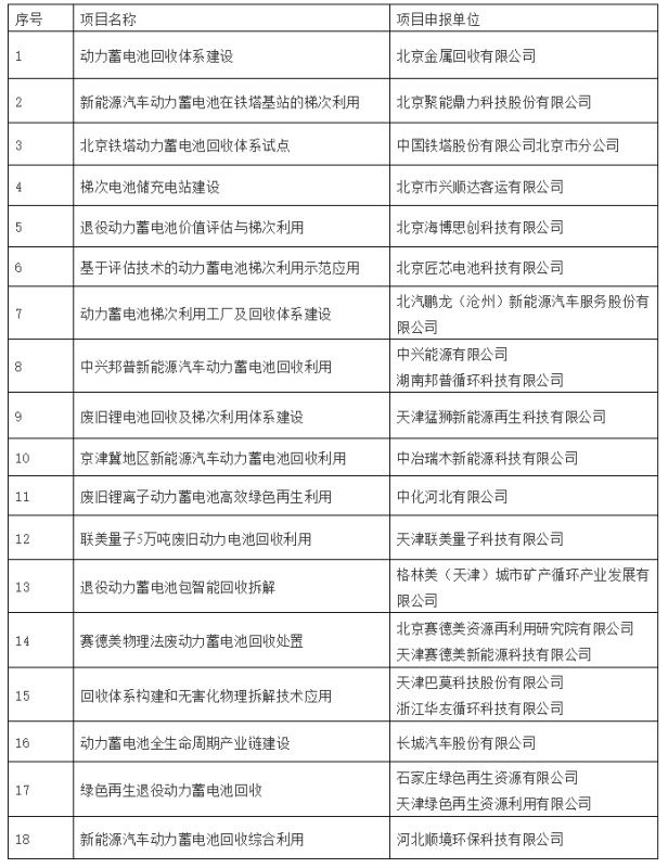 京津冀地區(qū)新能源汽車動力蓄電池回收利用試點示范項目公示名單(排名不分先后)