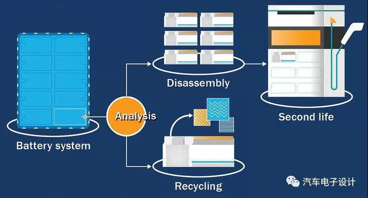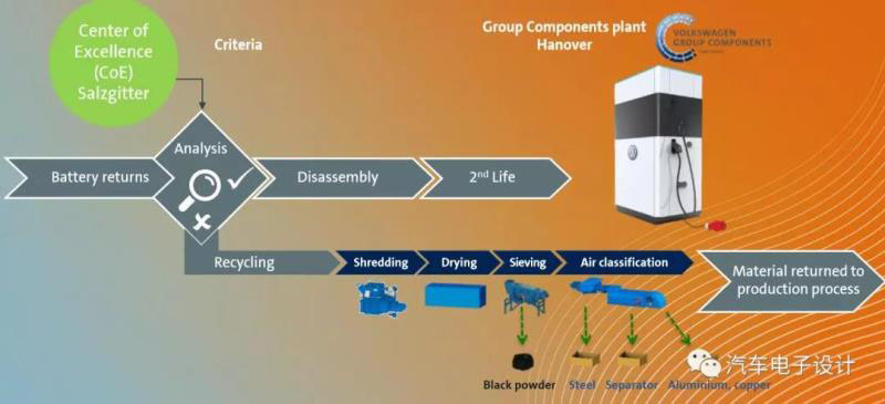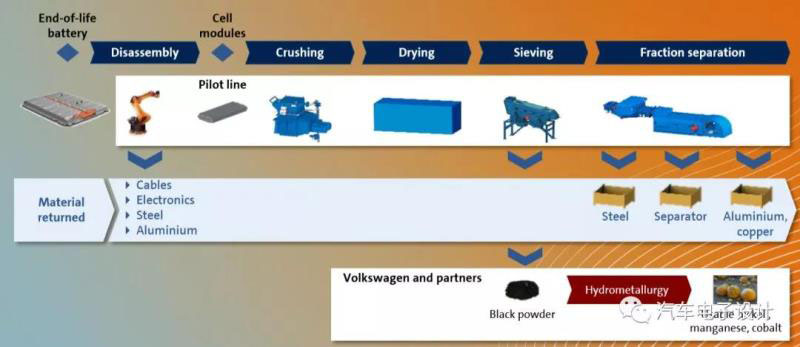 整個工藝過程如下圖所示,可以看到大眾考慮這件事情,是把模組作為最小的單元,模組以下就是統(tǒng)一機械化處理。所以這個模組整體是要能拆解的,而模組本身維修也好,后續(xù)分解也好作為一個整體。