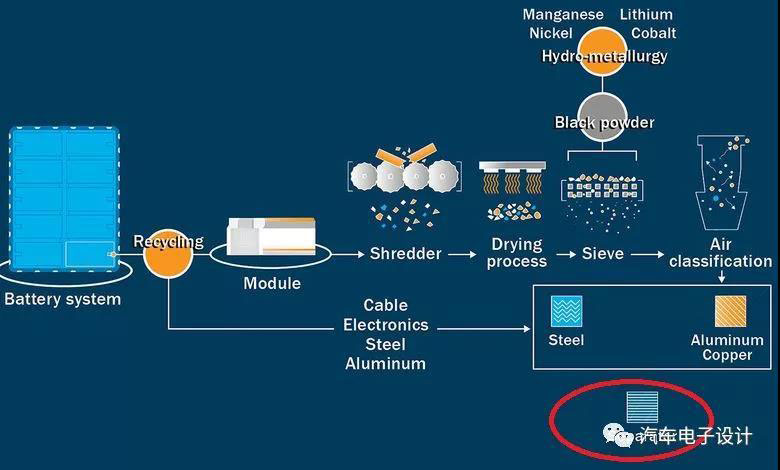 后段:把電池模組進入粉碎機,把整個模組切碎,然后烘干,通過特殊的機器進行篩選分解出黑色粉末(鎳,錳,鈷和鋰),最后通過分離的機械分解出鋼、隔膜、鋁和銅。