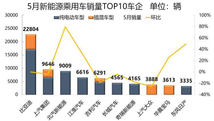5月車企Top 10榜單從名單上看與4月無(wú)變化,十家車企的新能源乘用車合計(jì)銷量占本月的76.3%。