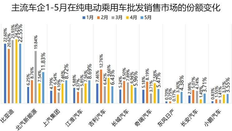 下圖中的十家車企中,在純電動(dòng)板塊的市場(chǎng)份額穩(wěn)步提升的是東風(fēng)日產(chǎn)和小鵬汽車。另一家比較引人注目的新勢(shì)力蔚來(lái)汽車今年前五個(gè)月在純電動(dòng)板塊的市場(chǎng)份額依次是2.5%、1.7%、1.5%、2.3%和1.4%。