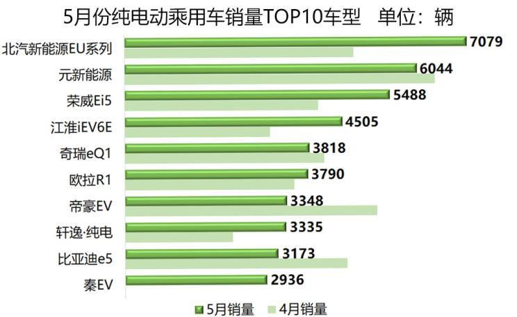 冠軍車企仍然是比亞迪,2.28萬(wàn)輛的銷量較4月微增0.68%,其中純電動(dòng)車型銷售1.72萬(wàn)輛,占比75%。上汽集團(tuán)銷量減少3.67%,不足萬(wàn)輛,其中純電動(dòng)車型銷售6642輛,占比69%。北汽新能源從上月的第7位躍升至第三,借力EU系列和EX系列大漲80%。