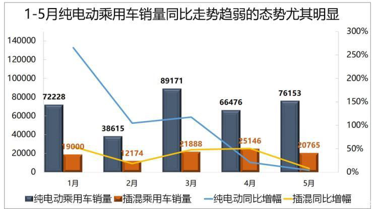 然而,今年以來(lái),純電動(dòng)乘用車板塊的市場(chǎng)走勢(shì)月月趨弱,月度同比增幅從3倍、翻倍銳減到5月的4.28%——5月份純電動(dòng)乘用車批發(fā)銷售76153輛,環(huán)比增長(zhǎng)14.56%,同比增長(zhǎng)4.28%,弱于新能源整體市場(chǎng);插電式混動(dòng)乘用車批發(fā)銷售20765輛,同比增長(zhǎng)8.37%,環(huán)比減少17.42%。
