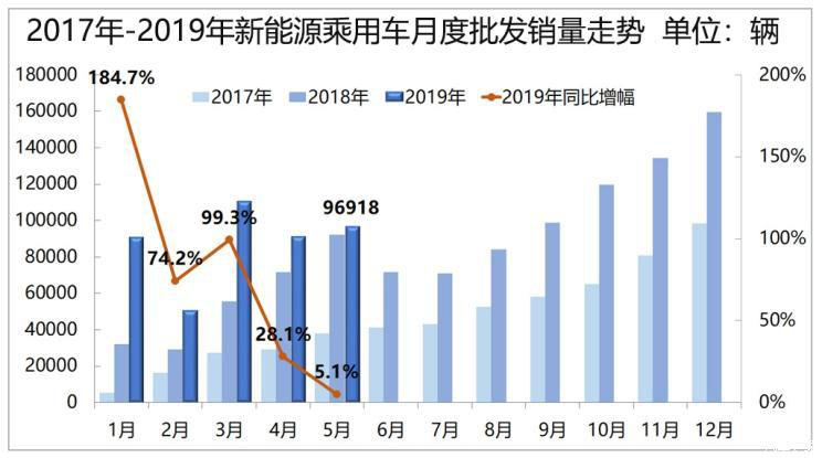 新能源乘用車市場(chǎng)也不再火熱。5月份,國(guó)內(nèi)新能源乘用車批發(fā)銷售9.7萬(wàn)輛,較4月微增5.78%,但是同比增速只有5.13%,這在國(guó)內(nèi)短暫且風(fēng)光的新能源車歷史上,簡(jiǎn)直不忍卒視。要知道,在2018年新能源乘用車每月的銷量同比增幅都在50%以上,翻倍也是常見的。
