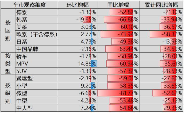 從乘用車品牌所屬國(guó)別、乘用車類型、車型級(jí)別的各個(gè)維度審視,每一維度的同比降幅也都進(jìn)一步加深,50%簡(jiǎn)直就是“入門水平”。夏至未至,國(guó)內(nèi)車市卻已身陷寒冬。