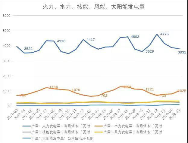 5月份,水電、核電保持較高增速但有所回落,受到用電需求增速放緩、水電擠占等因素影響,增速創(chuàng)2016 年 5 月以來新低。5月份,火電增速繼上月由正轉(zhuǎn)負后同比下降4.9%,降幅比上月擴大4.7個百分點;3、4月份,得益于南方部分地區(qū)來水較好,水電持續(xù)發(fā)力,同比增長分別為22.0%、18.2%,5 月增速回落至 10.8%,增速比上月回落 7.4個百分點;核電因新機組陸續(xù)投入運行,繼續(xù)保持較高增速,3、4 月分別增長 31.7%、 28.8%,5 月增速回落至 15.4%。風(fēng)電增長 19.4%,加快18.4 個百分點;太陽能發(fā)電增長 15.5%,加快2.1 個百分點。