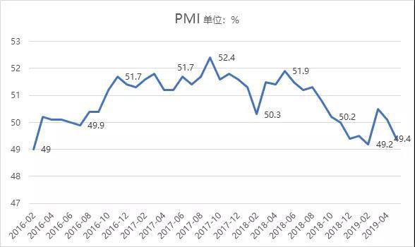 1~5 月份,規(guī)模以上工業(yè)增加值同比增長 6.0%,1~4 月增速為 6.2%,(去年同期值為6.9%)。2019 年5月份,中國制造業(yè)采購經(jīng)理指數(shù)(PMI)為 49.4%,比上月回落 0.7 個百分點,去年同期值為 51.9%。