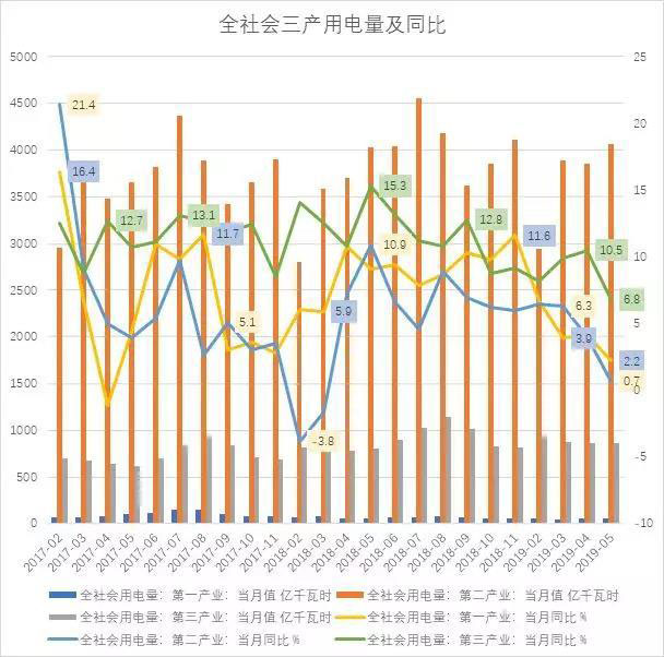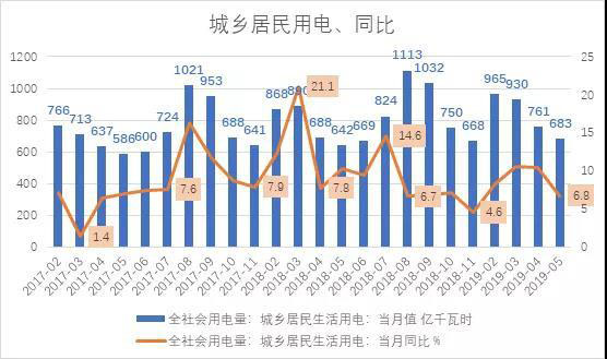 PMI、工業(yè)增加值顯示工業(yè)經(jīng)濟增速放緩,導(dǎo)致二產(chǎn)用電量增速較低。2019 年 5 月份,規(guī)模以上工業(yè)增加值同比實際增長5.0%,比 4月份回落0.4個百分點,(去年同期增長值為6.8%)。