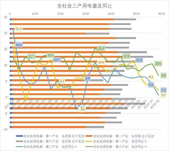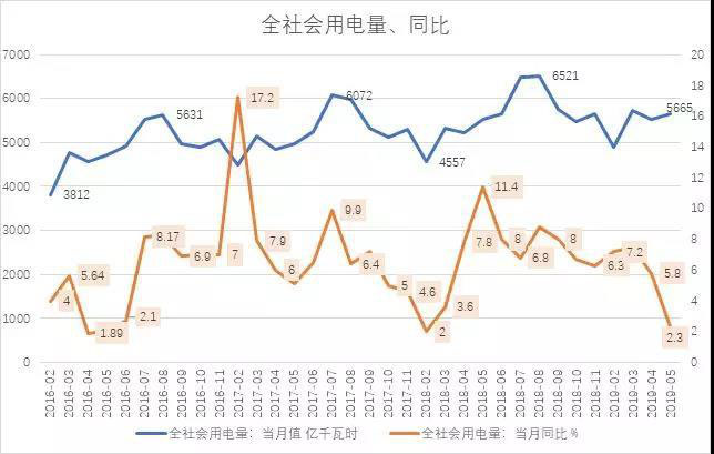 2019年5月,全社會用電量5665 億千瓦時,同比增長 2.3%,增速創(chuàng)下2016 年 6 月新 低(除2018 年 2 月春節(jié)因素之外),增速較上月回落3.5 個百分點,較去年同期回落 9.1個百分點。1~5月,全社會用電量同比增長4.9%,增速較去年同期回落 4.9個百分點。