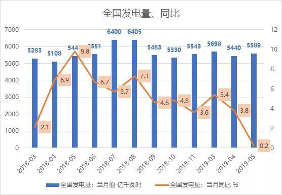 2019年 5月,發(fā)電5589 億千瓦時,同比增長 0.2%,增速創(chuàng)下2016 年 5 月新低,增速較上月回落3.6 個百分點,較去年同期回落 9.6個百分點。1~5月,發(fā)電2.8 萬億千瓦時, 增長 3.3%,增速較去年同期回落5.2 個百分點。