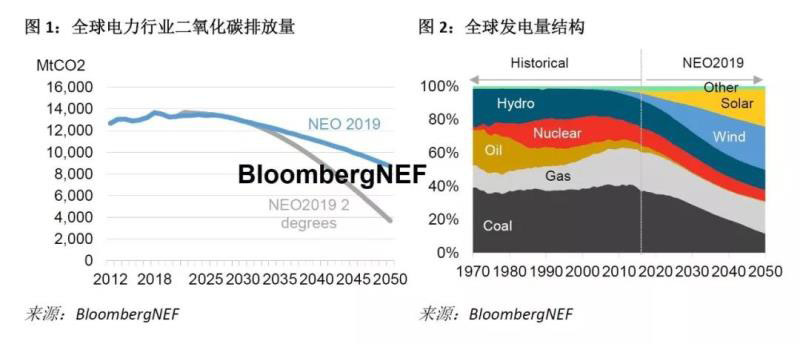 根據(jù)彭博新能源財(cái)經(jīng)(BloombergNEF)的最新分析,由于風(fēng)電、太陽(yáng)能和儲(chǔ)能技術(shù)成本的大幅下降,到2050年全球近一半的電力將由這兩種快速發(fā)展的可再生能源供給。BNEF在2019年《新能源市場(chǎng)長(zhǎng)期展望》(New Energy Outlook 2019,NEO)報(bào)告中預(yù)計(jì),這些技術(shù)將確保電力部門在2030年前為保持全球溫升不超過(guò)2度做出應(yīng)有貢獻(xiàn)。(世界經(jīng)濟(jì)的其他行業(yè)也需要在脫碳方面取得重大進(jìn)展,以應(yīng)對(duì)氣候變化。)