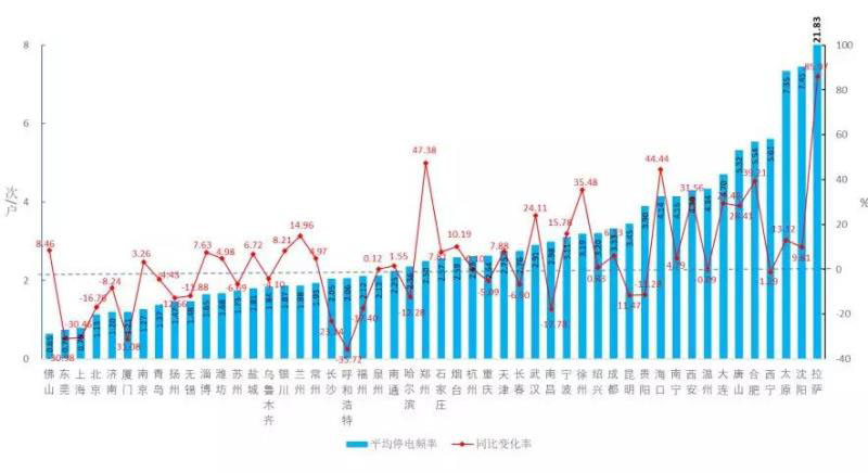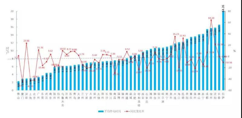 全國52個主要城市中有18個城市的用戶平均停電時間同比減少超過10%;13個城市的用戶平均停電時間波動超過20%,其中,廈門、上海、北京的用戶平均停電時間同比分別減少45.65%、42.41%、41.87%;徐州、昆明的用戶平均停電時間同比分別增加64.20%、32.43%。