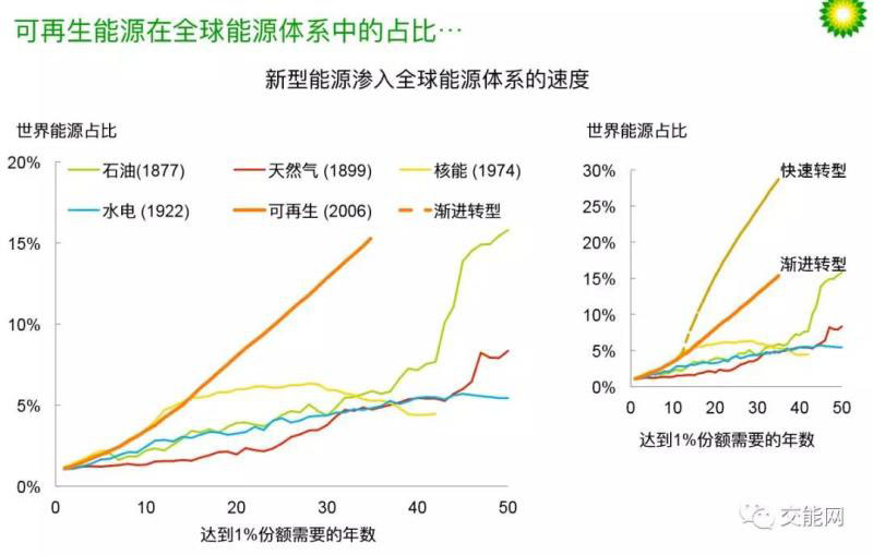 ● 在漸進(jìn)轉(zhuǎn)型情景下,可再生能源占比從1%增長(zhǎng)到10%需要約25年。這比歷史上任何能源的滲透速度都快