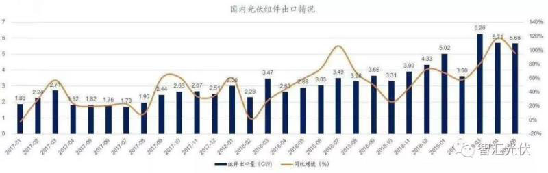 5月組件出口量為5.66GW,去年同期為2.89GW,同比增長(zhǎng)95.6%;1~5月份累計(jì)出口量為26.25GW,同比增長(zhǎng)84%。