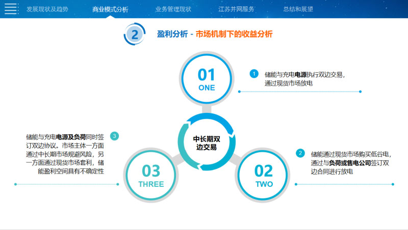 前面講的是執(zhí)行目前電價(jià)上的收益,后面講一下市場(chǎng)機(jī)制下的收益分析。目前國(guó)內(nèi)還是試點(diǎn),還沒(méi)有大范圍推廣,所以這個(gè)可以說(shuō)是未來(lái)幾年或者說(shuō)未來(lái)發(fā)展的一個(gè)趨勢(shì)。我國(guó)目前只有部分省份開(kāi)展了試點(diǎn),甘肅、陜西已經(jīng)開(kāi)展了電力現(xiàn)貨市場(chǎng),2018年中長(zhǎng)期交易電量達(dá)到27%。按照《全國(guó)統(tǒng)一電力市場(chǎng)深化設(shè)計(jì)方案》,2025年以后我國(guó)將全面實(shí)施電力市場(chǎng),到那個(gè)時(shí)候我們就存在省和省之間以及省內(nèi)的兩級(jí)電力現(xiàn)貨市場(chǎng)模式,大部分普通工業(yè)和大工業(yè)用戶(hù)自己的儲(chǔ)能電站可以直接或者間接的參與電力市場(chǎng)。