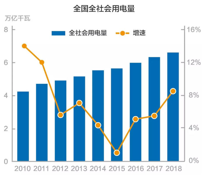 用電量歷來被稱為經(jīng)濟(jì)增長(zhǎng)的“晴雨表”。當(dāng)然,二者之間在特殊的年份有可能“脫鉤”,比如2018年用電量增幅再次高于GDP增幅。但從長(zhǎng)期看改變不了用電量與經(jīng)濟(jì)的正相關(guān)關(guān)系。過去10年用電量的低速增長(zhǎng)就證明了這一點(diǎn),這也是國(guó)家宏觀調(diào)控政策穩(wěn)中求變、不斷發(fā)力的結(jié)果。