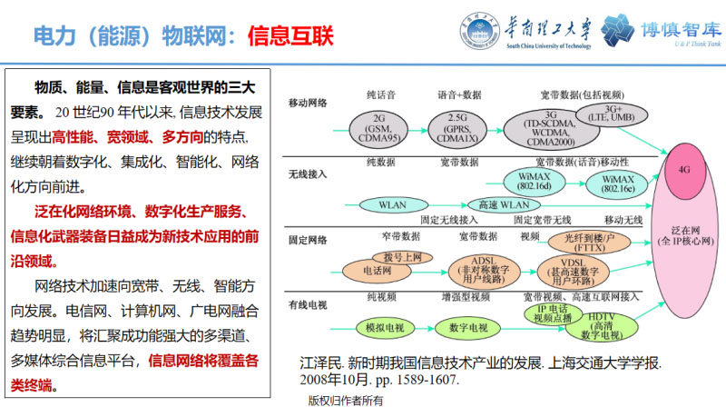 在信息互聯(lián)的層面,泛在電力物聯(lián)網(wǎng)的概念出來后我就查找“泛在網(wǎng)”概念的最初來源,后來我找到江澤民總書記2008年在《上海交通大學(xué)學(xué)報》上發(fā)表的一篇文章《新時期我國信息技術(shù)產(chǎn)業(yè)的發(fā)展》,里面就提了泛在網(wǎng)。它來自于英語單詞Ubiquitous Network,是能夠?qū)崿F(xiàn)人與人、人與物乃至物與物之間隨時隨地溝通的全新網(wǎng)絡(luò)環(huán)境,而且很驚訝的是他預(yù)言泛在網(wǎng)將會像電網(wǎng)、管網(wǎng)一樣成為通用型基礎(chǔ)設(shè)施。這個正在逐漸變成現(xiàn)實,其實以后5G就是一個最典型的泛在網(wǎng),5G網(wǎng)絡(luò)可以同時支持人與人的連接,也支持物與物的連接。江總書記的那個文章里面給了一個圖,從傳感器網(wǎng)絡(luò)到接入網(wǎng)絡(luò),到中間件到應(yīng)用,正好對應(yīng)于國網(wǎng)提出來的泛在電力物聯(lián)網(wǎng)的四個層次,即從感知層(傳感器網(wǎng)絡(luò)),到網(wǎng)絡(luò)層(接入網(wǎng)絡(luò)),到平臺層(中間件),然后到應(yīng)用層,這個層次是很清晰的。