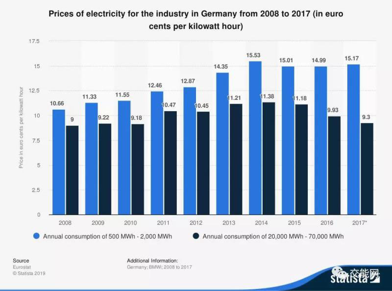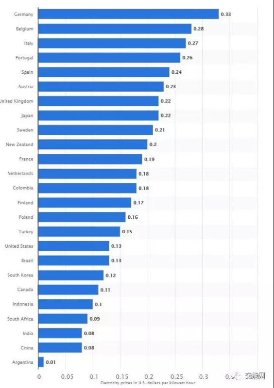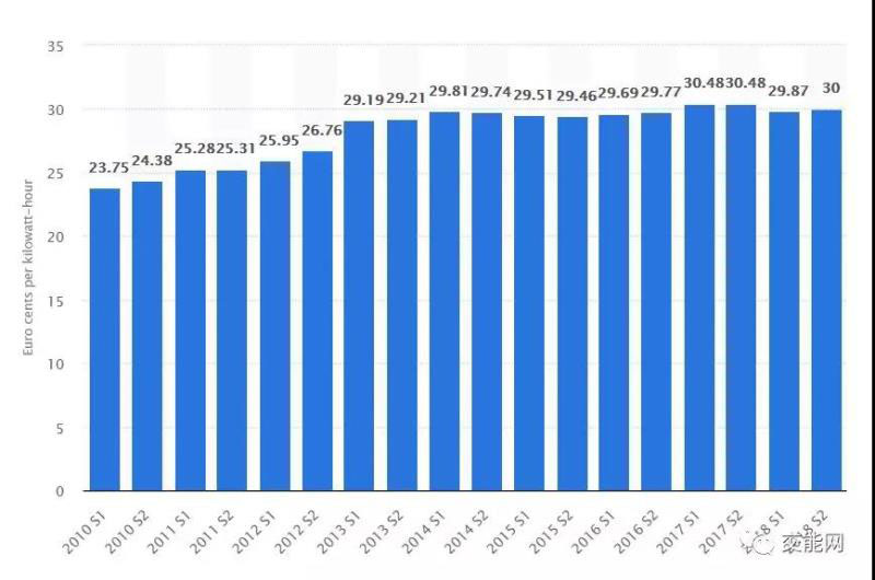 2018年德國(guó)民用電平均電價(jià)為0.3歐元每千瓦時(shí),在歐盟僅次于丹麥的0.31歐元每千瓦時(shí)位居第二,甚至在全球電價(jià)最高的國(guó)家名單中名列前茅。
