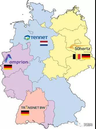 德國(guó)超過(guò)80%的電力來(lái)自4家大型跨區(qū)電力公司( E.ON、RWE、Vattenfall Europe、EnBw),其中前兩家占了60%。這4家電力公司所分離出的獨(dú)立主體又擁有整個(gè)德國(guó)輸電網(wǎng),供電范圍如下:
