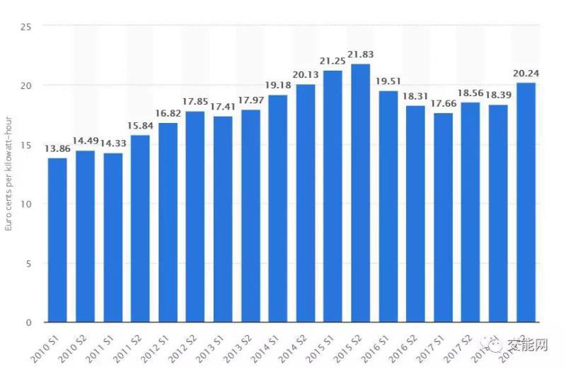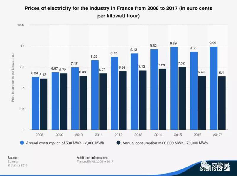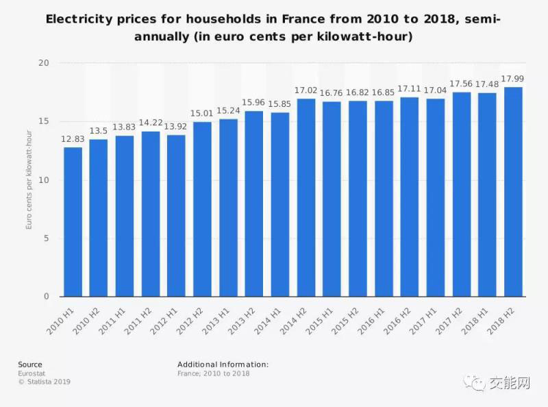 2018年法國(guó)民用電平均電價(jià)水平為0.18歐元每千瓦時(shí),與2010年相比,上漲了約40%。
