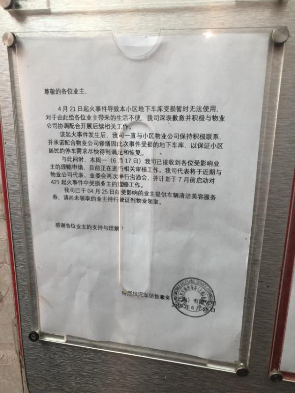 事發(fā)小區(qū)樓棟內(nèi)貼有落款為“特斯拉公司汽車(chē)銷(xiāo)售服務(wù)(上海)有限公司”的理賠告示。 澎湃新聞?dòng)浾?楊帆 圖