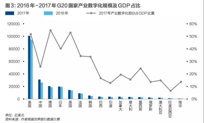 伴隨數(shù)字技術(shù)向傳統(tǒng)產(chǎn)業(yè)融合滲透不斷深化,呈現(xiàn)出數(shù)字產(chǎn)業(yè)化占數(shù)字經(jīng)濟(jì)的比重逐步減少,產(chǎn)業(yè)數(shù)字化占數(shù)字經(jīng)濟(jì)比重相應(yīng)上升的發(fā)展態(tài)勢(shì)。G20國(guó)家數(shù)字經(jīng)濟(jì)結(jié)構(gòu)中產(chǎn)業(yè)數(shù)字化部分的比重由2016年的84.18%提高到2017年的84.47%,數(shù)字產(chǎn)業(yè)化部分比重相應(yīng)地由15.82%降低到15.53%。反映了全球數(shù)字經(jīng)濟(jì)正逐步向ICT產(chǎn)業(yè)與傳統(tǒng)產(chǎn)業(yè)深度融合發(fā)展的方向邁進(jìn),行業(yè)間的跨界融合與垂直整合將進(jìn)一步影響數(shù)字經(jīng)濟(jì)的產(chǎn)業(yè)發(fā)展格局。