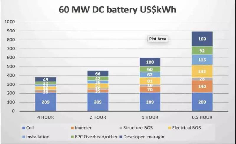 下圖的數(shù)據(jù)源自NREL 2018年的一篇文章,該組數(shù)據(jù)所要顯示地是在不同使用時長下,60MW公用事業(yè)規(guī)模儲能電池成本組成情況。60MW電池的使用時長可以達到30分鐘(30MWh)至4小時(240MWh)。