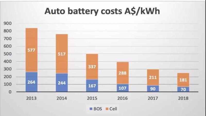 從圖中可以看出,BOS(除電芯外的其他部件)成本下降得最快——每年大約下降25%,而電芯成本每年則下降23%。在此基礎上,一輛電動汽車安裝一套售價為1.5萬澳元的60KWh的電池組,在每行駛100公里消耗19KWh的條件下,可達到300公里的行駛里程。從目前的成本來看,要讓電動汽車真正進入主流市場,該成本還需降低一半,這或許還需要5年時間。但本文就此先不做重點討論。
