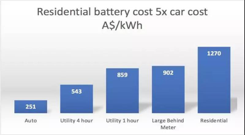 基于每千瓦時的安裝成本(美元),家用電池的安裝成本約為電動汽車所用電池的5倍。除了電池本身的費用,家用電池比動力電池多出來的費用,主要來源于除電芯外,儲能電池系統(tǒng)中其他部件的成本費用。