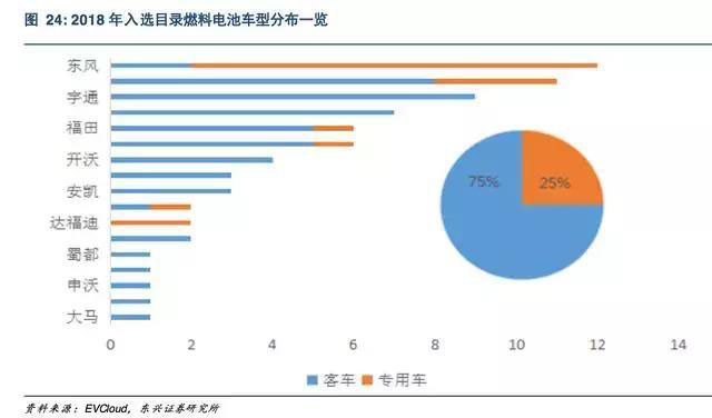 2018年發(fā)布的6-12批新能源汽車推薦目錄中,燃料電池汽車共有72款車型入選,其中客車54款,占比達(dá)到75%。2018年入選的車型中,燃料電池系統(tǒng)額定功率達(dá)到30-40kw的車型有45款,達(dá)到40-50kw的車型有13款,50kw以上的車型有14款。目前國(guó)內(nèi)燃料電池水平總體與國(guó)外差距較大,日本的燃料電池車型額定功率基本在120-200kw。