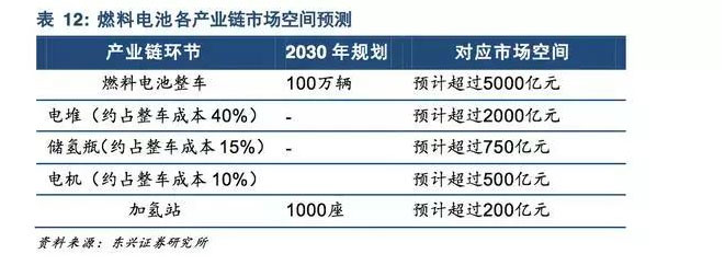 國(guó)內(nèi)2030年燃料電池汽車商業(yè)推廣計(jì)劃超過(guò)100萬(wàn)輛,預(yù)計(jì)對(duì)應(yīng)市場(chǎng)空間超過(guò)5000億元。按照電堆成本占比40%,儲(chǔ)氫瓶成本占比15%,電機(jī)成本占比10%計(jì)算,預(yù)計(jì)2030年國(guó)內(nèi)燃料電池電堆、儲(chǔ)氫瓶、電機(jī)對(duì)應(yīng)市場(chǎng)空間分別超過(guò)2000億元、750億元和500億元。